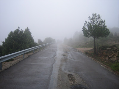 Pues nada, que a las 7 del sábado 4 de junio arranco dirección Alcanar para subir el Remei y llegar a Ulldecona. A partir de aquí, agua. Y desde el barri Castell a la Sénia, la carretera parecía un rio. Madre mia cuanta agua! Con arrojo y tesón subo el pantano primero, el tauletí después y a mitad subida del Boixar paro a comer algo y quitarme los calcetines (hasta Alcañiz ya no me los puse). Del Boixar a Castell de Cabres, mucha niebla, agua, frio,... fatal climatologia. Tras llenar bidón de agua prosigo dirección a Herbes, bajando el puerto de Torremiró por esta cara, con la carretera mojada y densa niebla, toda una temeridad. Después tras pasar por Peñarroya, remonto hasta Monroyo, donde paro a comer tranquilamente. De nuevo al ataque, empieza lo hasta entonces desconocido para mi. Paslo por la Cerollera, Belmonte, la Codoñera, Torrecilla y llego a Alcañiz, donde paro a comer y beber, y cambiarme de ropa.