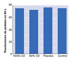 Revoluciones de pedaleo conseguidas durante una sesión de 60s de esfuerzo total en un cicloergómetro. La segunda serie se ejecutó 2 min después de una primera idéntica. Se suministró oxigeno (60%. y 100%) o aire normal entre las series a ciegas.Texto extraido del Libro Filisofía del esfuerzo y el deporte.